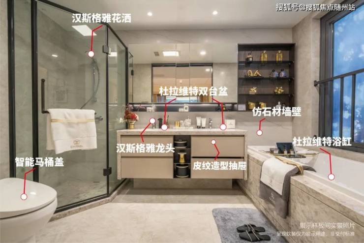 厨房标配的是西门子四件套,油烟机、燃气灶、洗碗机和蒸烤一体机一样不落,足以满足“大厨们”的各种炫技操作;卫浴空间配置了杜拉维特双台盆、汉斯格雅龙头花洒、杜拉维特浴缸、智能马桶盖......简直就是一个大牌博览会。