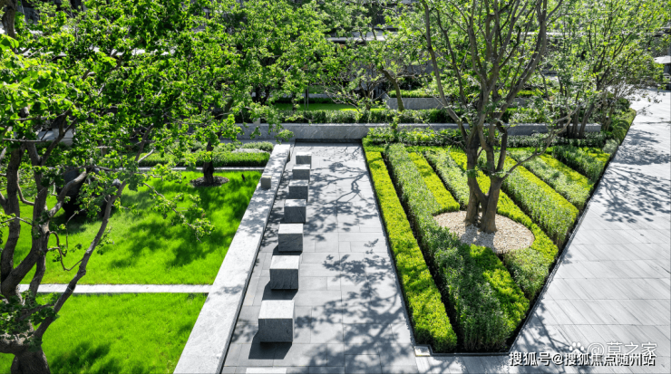 为增加园区入口的仪式感与尊贵感,西入口以三亚柏悦的镜面水景为灵感造景,层层叠水沿着景墙层层而下,水流撞击石材的声响,恰能隔绝外界的喧嚣。亨利・摩尔的不锈钢雕塑《宇宙与生命的骨形》静立其后,抽象线条与流水、树影缠绵,仿佛在说:最好的艺术,本就该生长在自然里。