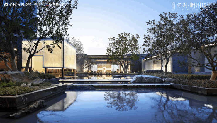 宁波保利·明州瑧悦府水院中的水榭,还做了下沉式设计,当你惬意地坐在这个水榭中,水面恰好与你的头部差不多齐平,这样看出去,这个水院就被无限放大,镜面的水院好似广阔的自然湖面,一切树影摇曳、阳光熠熠都尽收眼底。
