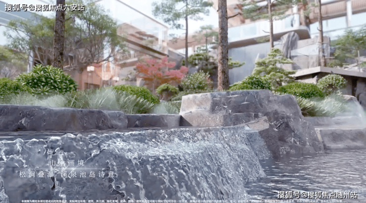 绿城·馥香园的山水庭院设计,巧妙融合了山、水、石、树等元素,呈现出一种独特的视觉美感,仿佛将人们带入了一幅生动的青绿山水画卷之中。其中,流水跌瀑的设计尤为引人注目,老皮石模拟的天然崖壁与山石错落叠放,水瀑落下时飞珠溅起,营造出一种“断山疑画障,悬溜泻鸣琴”的诗意氛围。
