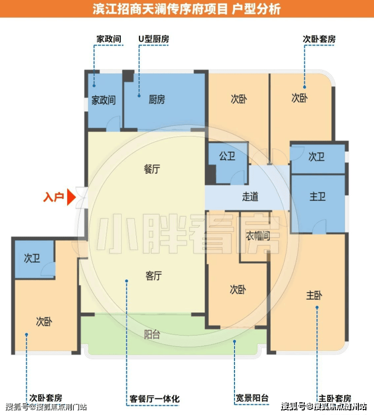 1、这款是南向阳台+南向双套房,背面也有个带独卫的套房,主卧带有衣帽间,南次卧阳台和客厅相连接,这样晾晒的隐私性比较好,从阳台过去也较为方便,不用从次卧进。