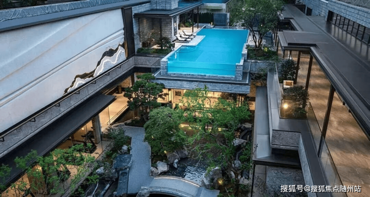 悬挑泳池尤为让人瞩目,创新设计江南岸首个悬挑式无边际泳池,搭配流水幕帘与青玉雕刻的“聚宝盆”,水流潺潺间,不仅度假氛围浓郁,蕴含“吉祥美好”的寓意。