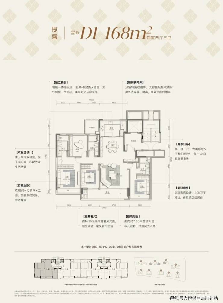 ❶建面约168㎡D1户型:4房2厅3卫,2梯2户,设有独立电梯厅,含赠送得房率约88%左右。