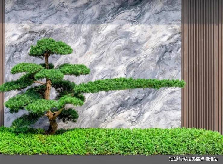 在“屏风”左右,辅以苍劲的罗汉松,彰显山水画卷中的工笔之美。大堂的表面,采用石材整体平铺,纹路清晰美观。用手触碰之,石材细腻温润。这样的设计组合,迅速提升了朗玥华章的“门面”之美。