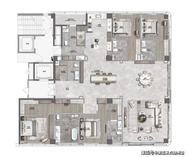410㎡湾潮户型:WSD上海世尊团队执笔,以独一无二的“摩登东方”设计语言,抽象提取东方写意精神,与复古摩登、自由艺术平衡相融,领潮钱湾黄金时代。