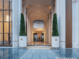 项目立面,区别于常规的对称手法,采取局部非对称设计进行了特色打造,色调上则选取质感更佳的高级灰,并辅以金色装饰线条及大面积玻璃修饰,视觉呈现上更具层次感和立体感,而顶部创意打造香槟色的金属格栅塔冠,则赋予了整体更高的辨识度。