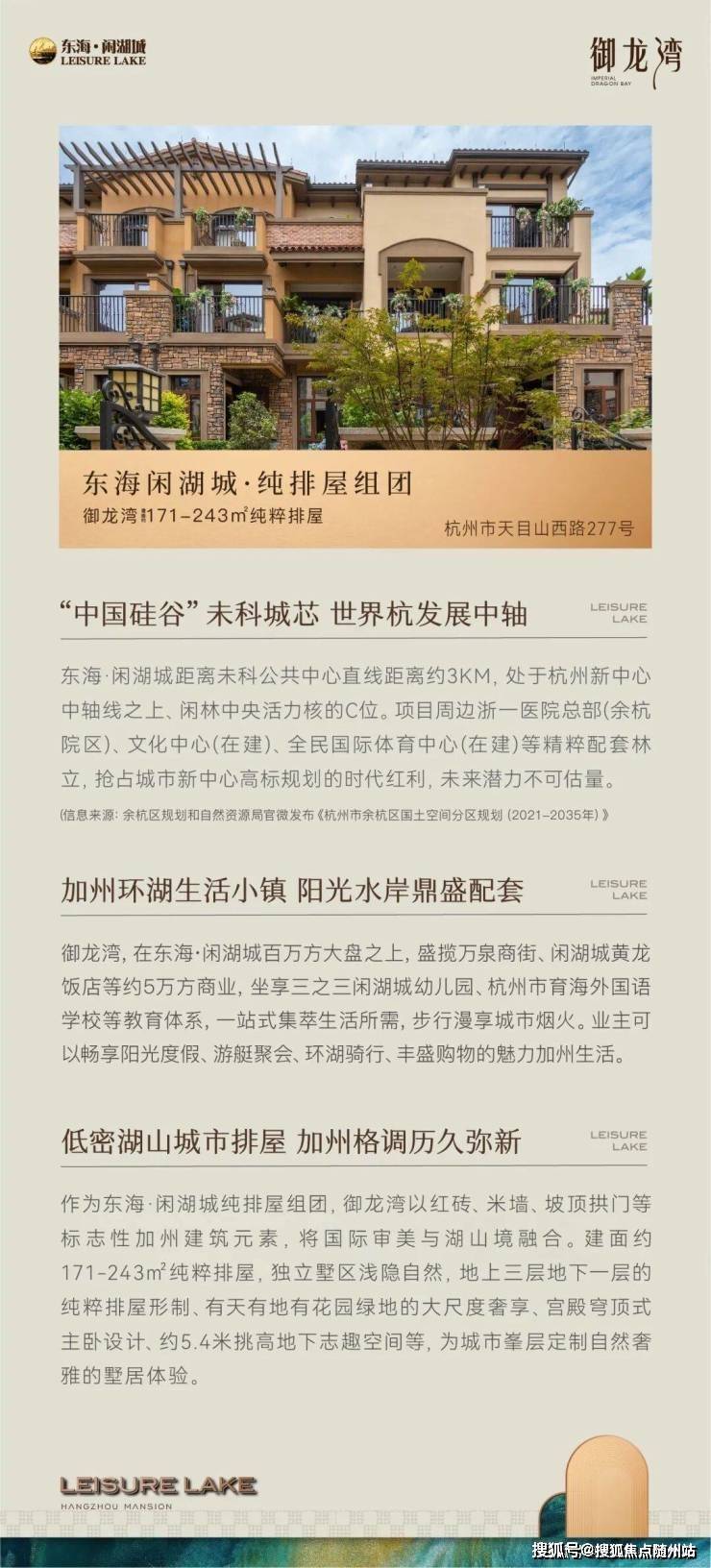 杭州第三中心内具有加州格调、既有高层又有排屋、生活教育设施配套齐全、环境优美沿湖而居的美丽生活小镇「东海·闲湖城」大城已成!纯排屋组团——御龙湾正式交付