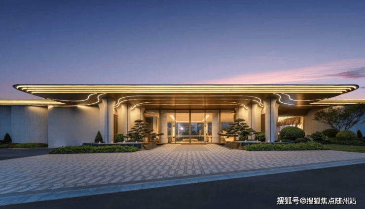 门前两棵罗汉松;园区内的中央园林围绕新型蓝宝石戏水池打造,营造澜韵迎宾、松鸣涧语、鸣泉叠韵、鸣芳拾趣、鸣香径幽等九境空间。