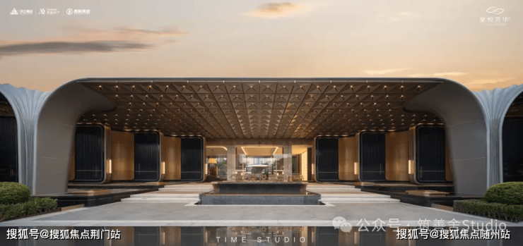 棠悦芳华轩大门实景:萃取东方礼制精髓,沿东西向主轴设置多重归家院落,形成主入口至迎宾水院及度假水池为一体的礼序归家轴。层层递进的空间,在步移景异中,营造出多重归家仪式。