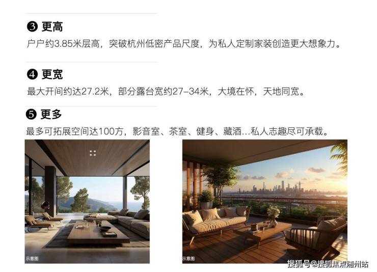 3.85米层高(超常规产品30%),为吊顶、智能家居系统留足空间;270°环幕露台最大开间27.2米(部分延展至34米),引山景入室。