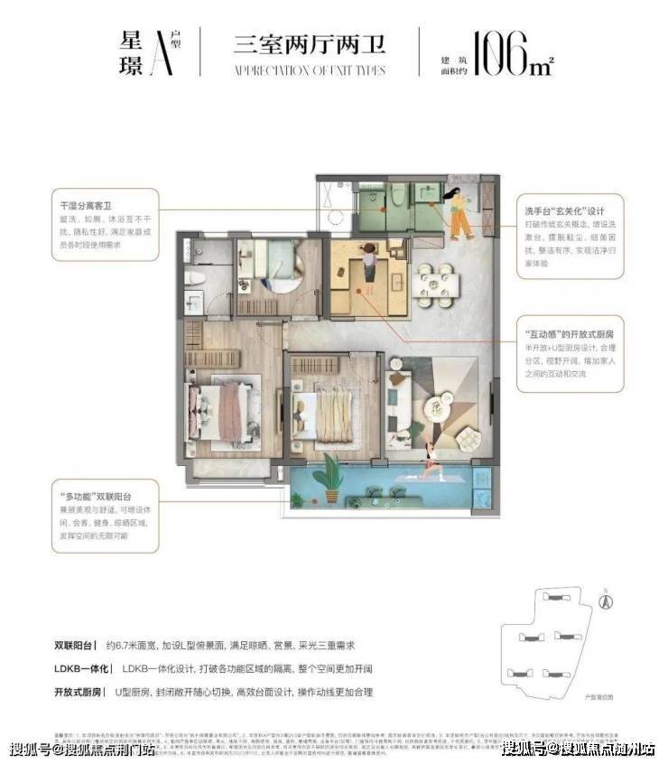 客厅面宽也从常规的约3.4米扩展到了约3.6米,让公共空间更加明亮宽敞。 双联宽景阳台达到了约6.7米,晾晒空间更大、视野更好,还能作为瑜伽、健身等活动空间。