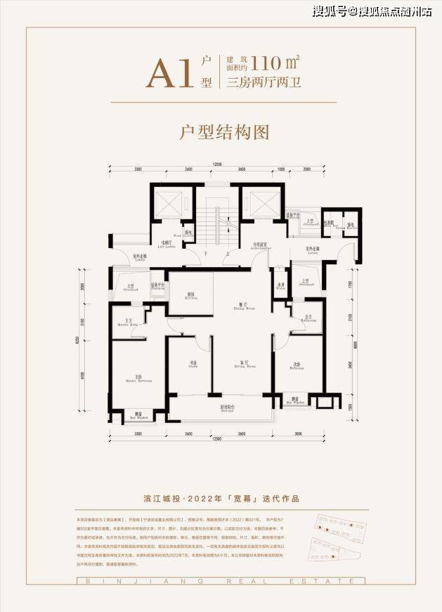 【A1户型】建面约110㎡,三室两厅两卫全明户型,户型四开间朝南,南向开间约12.5米,这个面积段有这样的开间尺度在整个市面上也是不多的,主次卧带飘窗设计,同时次卧、客厅南向连接约长6.2米阳台,整体户型正气明亮。