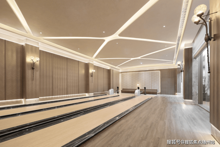 会所里,健身房、棋牌室、私宴厅、中心水吧、KTV包厢、保龄球馆环形排布,隔窗对望室外庭院,兼顾空间秩序感和生活交互感。