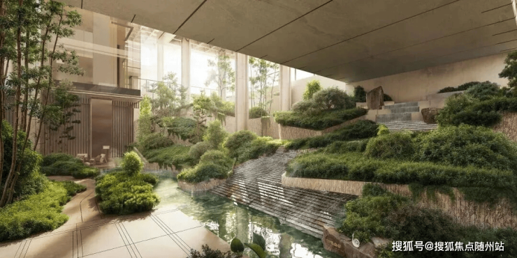 在这个立体悬浮世界里,有着天台层、归家层和下沉庭院层的垂直景观布局,并打造了穿长廊、见溪潭、叠流韵、揽河景、探幽境的五序立体归家风景。虽然只有短短几步路,却感觉穿越了山川与湖海。