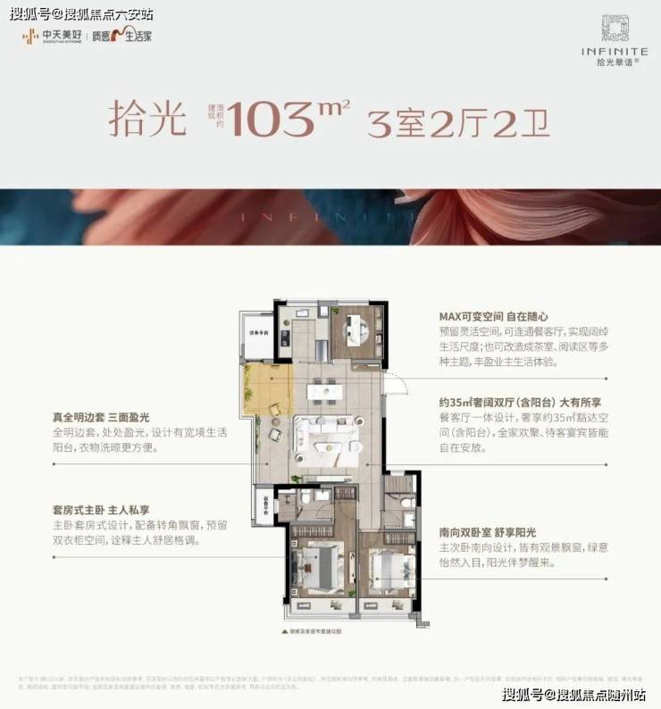 建面约103㎡的边套更是堪称神迹,将小户型的空间魔法玩到了极致。客厅到阳台的地面、天花直接拉通,甚至两侧的墙垛都已隐身,整个餐客厅面积达到约35㎡(含阳台),这可是140㎡以上大宅才有的空间感!