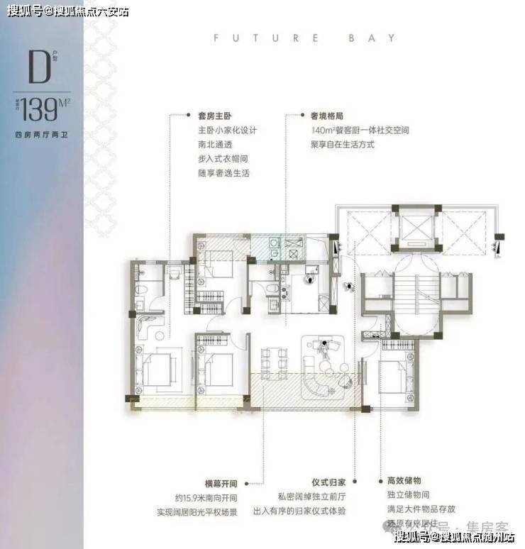 约139方户型, 4.5开间朝南+储藏间,南向15.9米超大采光面,做到五开间朝南的空间,标配储藏间,三个南向卧室设计。