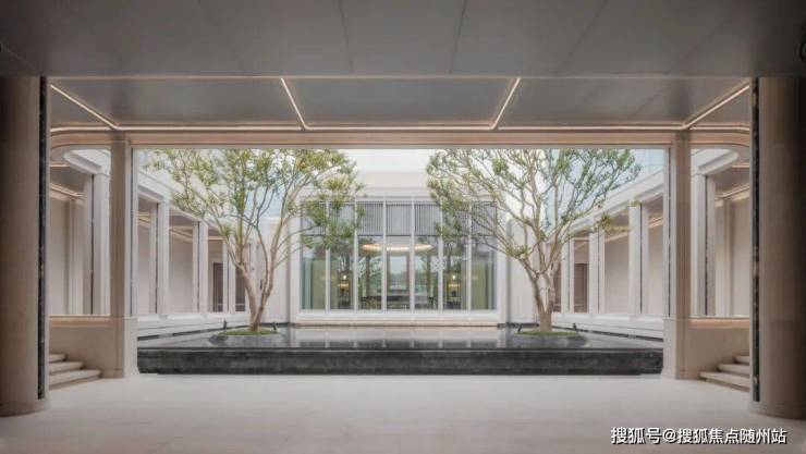 穿门而入抵达「柱廊玄厅」,只见两侧方形立柱以及通透的回廊,将喧嚣隔绝在外。你再缓步前行,就能看到以古典主义园林水景+泉池的设计手法打造的「美泉镜池」,这一方几何图形的水景庭院,让你收获满满的松弛感。