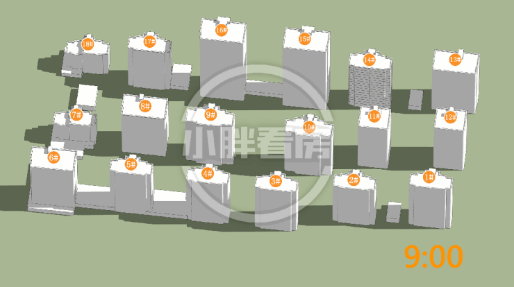 夏季:由于楼栋建筑角度为西南偏转和夏季太阳角度问题,楼栋上午处于阴影中,日照略有缺失。14#中低层受遮挡。就具体遮挡时间而言,14#主要在下午受15#遮挡。