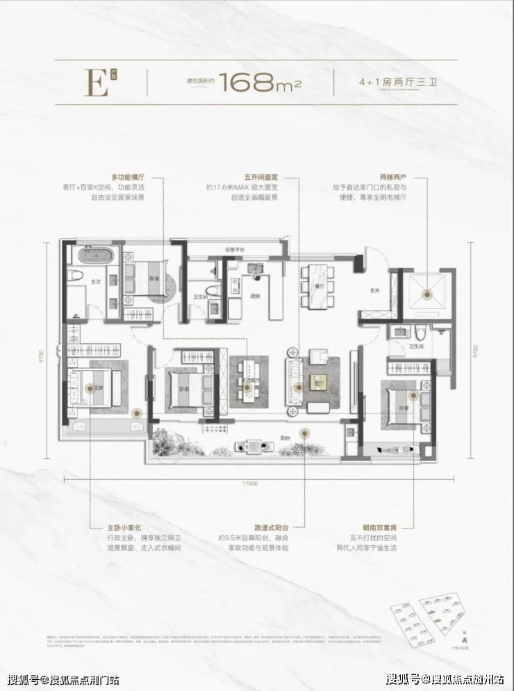 143户型则更可被称之为户型界的“卷王”,可以实现超越160+户型的越级享受。具体而言,4.5开间南向面宽达到 约 14.55米,呈现 IMAX巨幕观景面和采光面; 双套房主卧开创性的全部朝南,搭配独立卫浴 +衣帽间,给予父母或者孩子更好的居住体验;约 6米宽屏大横厅,与三开间跑道式阳台相连,内外空间无界相连,延伸生活的无限想象。