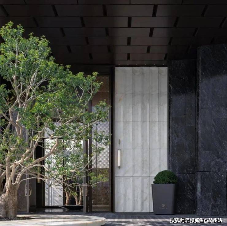 保利·海晏天珺是用室内思维来做户外景观。走进门厅,你会发现他们同样也是用室内思维来做公区设计:大堂地面的玉石铺装,也是编织艺术;地下的下沉式庭院入口的地面玉石铺装,灵感来自宁波当地的「竹编」与「天一阁」窗花元素。