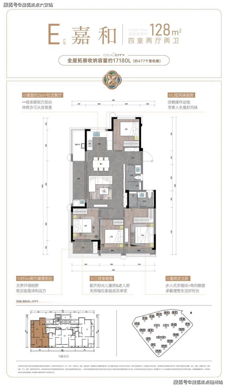 建面约107㎡户型,则把重点放在舒适度上。阔绰方厅+双联阳台,通风赏景至佳,还有U型厨房,三面操作空间,动线流畅好用;套房式主卧更配置了步入式衣帽间,独立卫浴设计,保证了主人家的隐私和仪式感。