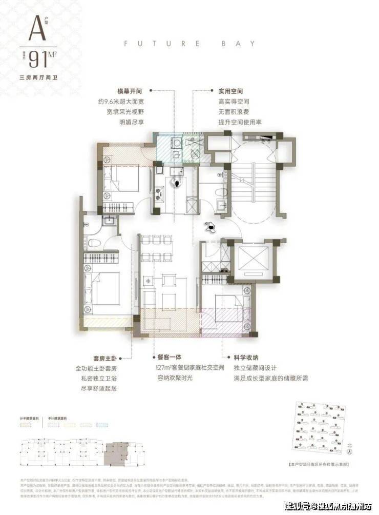 91㎡起步三房做到三开间朝南,约9.6米超大面宽搭配27㎡餐客厨一体化空间,最小卧室也有约9.5㎡。居然还带一个储藏间!小户型也不显逼仄。