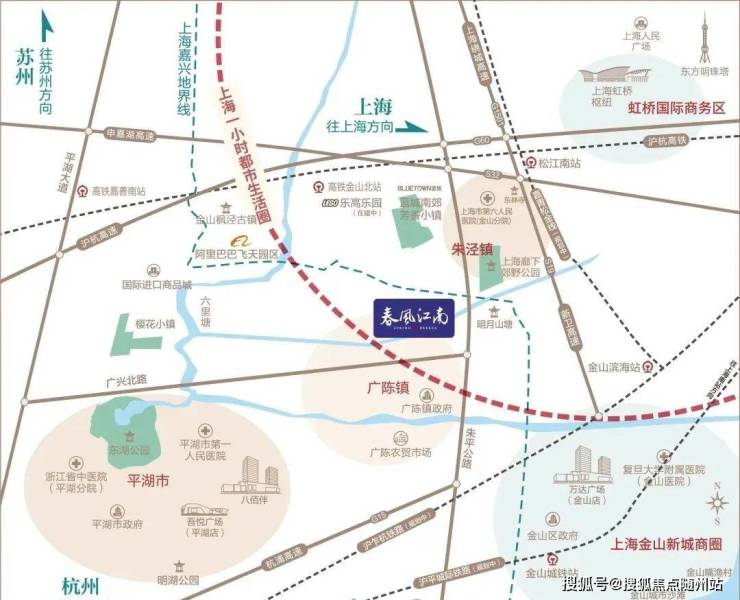 与上海金山廊下仅一河之隔,距金山北高铁站约20公里,距莲廊专线约2.5公里,平沪两地将实现“半小时高铁圈、一小时通勤圈”。