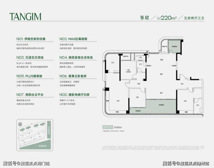 起步170㎡,主力户型220㎡以上,规划了7幢20-22F高层和6幢7F洋房。北高南低,南侧拥抱城市公园,户户采光俱佳,是一个纯粹的高端改善项目。
