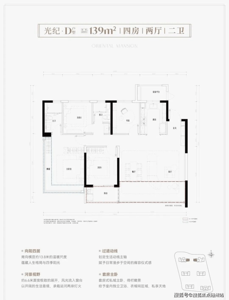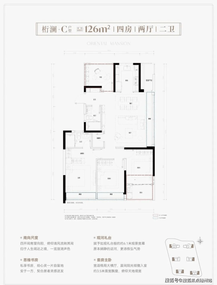 项目由六幢17~24层的高层住宅组成,总图布局采用南低北高的递进式布局,大尺度楼间距勾勒出中央花园,通过「一轴多节点」景观设计,打造步移景异的园林空间。