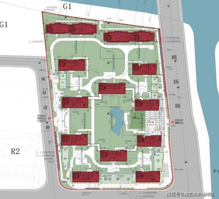 小区整体楼间距在35米左右,楼王8号楼南向楼间距约78米,主出入口设置在小区东侧的顾扬路。