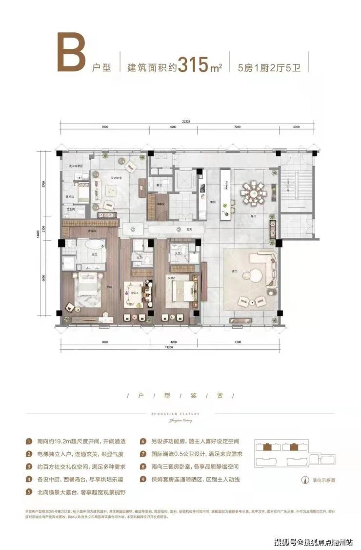 和市面上的其他宽景平层不同,HCC中天纪并没有在300多方的空间里规划出5-6个房间,而是保留了约100方空间作为公共社交空间,完全满足了商务、办公、居住等多重需求。由于公共社交空间被扩大了,因而整个房间的视野和采光面就被大大拓宽了。以C户型为例,四开间朝南,南向的总开间有近22米,西面还有15米的采光面。
