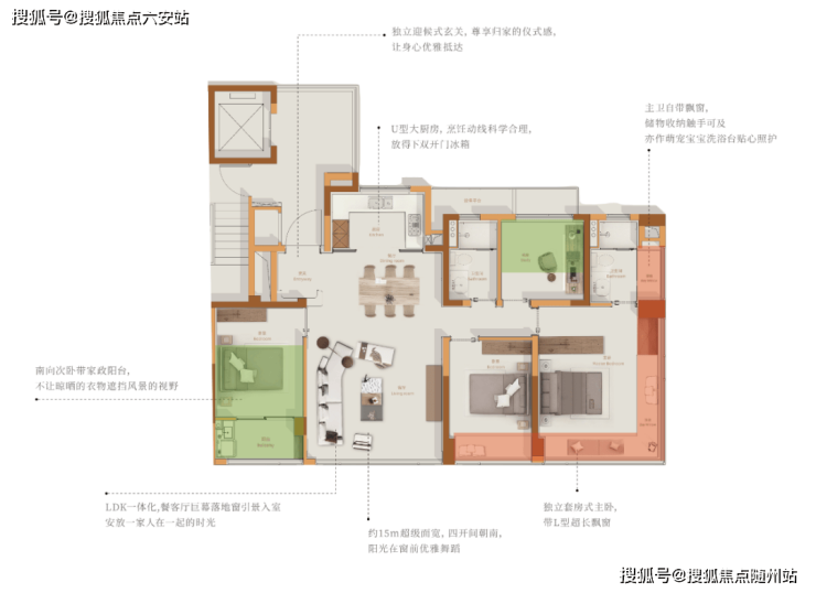 U型厨房与餐厅相连,轻松容下双开门冰箱;主卧独立套房,媲美豪宅的270°转角大飘窗设计,坐拥无敌视野。