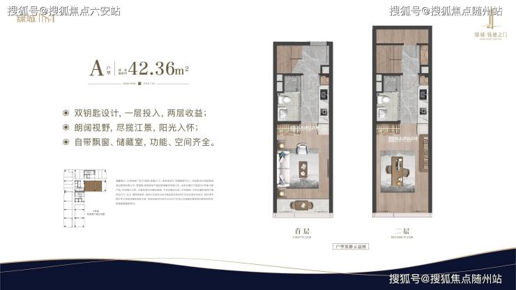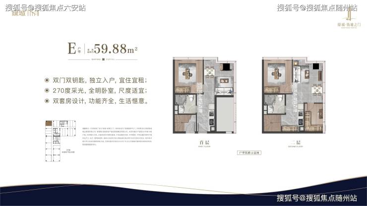 地标级产品,4.79层高,精英公馆35-59方,单门双钥匙和双钥匙,买一层得两层,买一套得两套,总价42万起