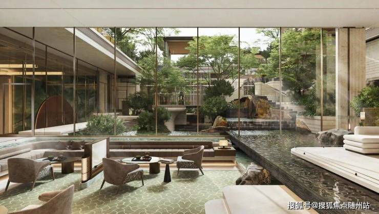 会所围绕9米落差的中庭展开,蓝颂景观团队以西湖郭庄为范本,再现经典造园元素。最惊艳的是空中恒温泳池:6米挑高空间里,廊桥飞架半空,游泳时抬眼可见“桥影落碧波”;泳池边的薄水池更从室外漫溢至室内,模糊了建筑与自然的边界,成就杭州豪宅罕见的“边界消融美学”。