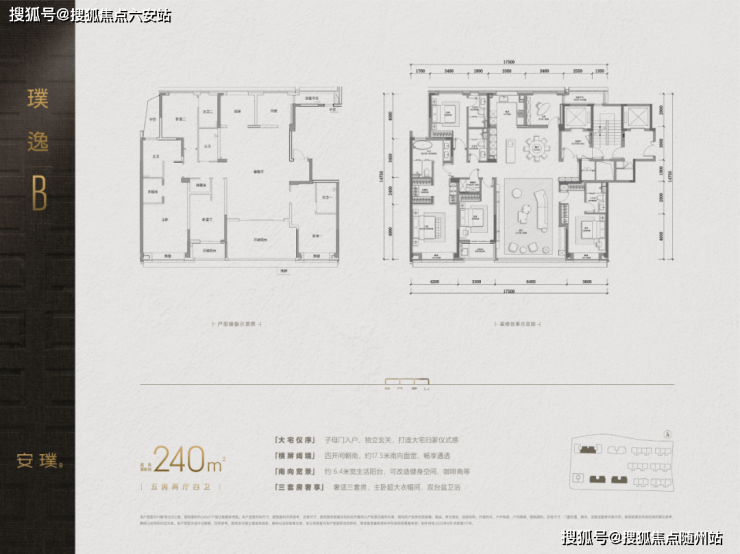 以约240平方米户型为例,该户型设计为五房两厅四卫,拥有四开间朝南,约17.5米南向面宽,畅享通透光照。约6.4米宽生活阳台,可改造为健身空间或咖啡角等多功能区域。