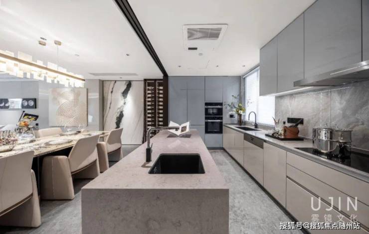餐厅 厨房与楼梯间,设立了开放的中岛台,形成视觉隔断,在增添功能性的同时,也流露出设计师严谨的美学思考,以及对空间节奏的把控!