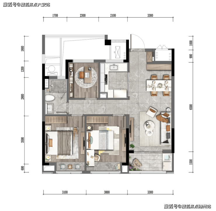 106㎡三房两卫,均为边套。边套最大的感觉就是公区非常阔绰,约6米的边厅自带飘窗,尺度感非常强。
