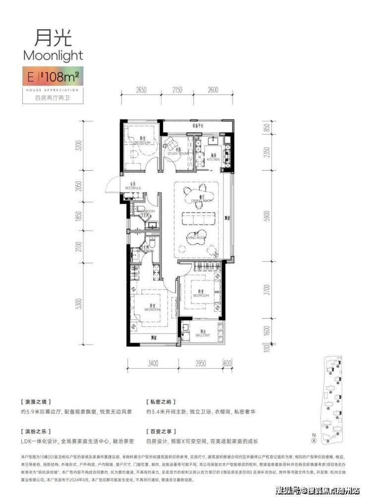 还有建面约108方东边套户型,做到了同级少有的4房2卫巨幕客厅设计。