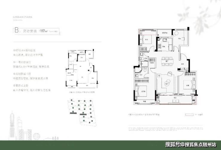 约117-118㎡户型为经典四叶草格局,三开间朝南面宽达到约10.4米,客厅与次卧贯通的长阳台近6.8米长。一体化餐客通厅设计,连接盛景阳台,满足家庭聚餐、亲子互动等多元化需求。北向次卧的面积超过约10㎡,实用性强。