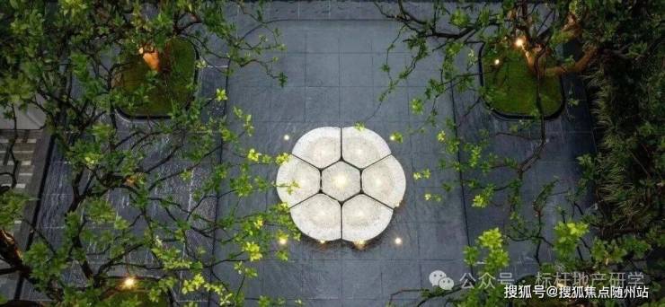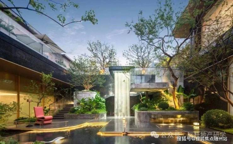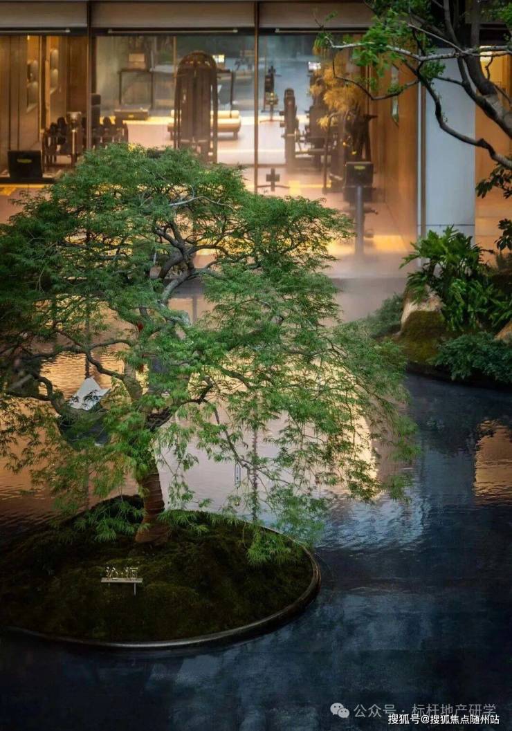 下沉式庭院与一层地面高差达5.2米,巧妙利用高度差与围合设计,打造了一个立体花园,层次鲜明,美不胜收。飞瀑如丝带般串联起地面与下沉空间,辅以阶梯式绿化与错落有致的镜面树池平台,营造出强烈的空间立体感。庭院的选材同样考究,如瀑布两侧挺拔的老桂树与水池中的羽毛枫,不仅美化了环境,更蕴含着美好的寓意,每一处细节都经过精心打磨,品质非凡。