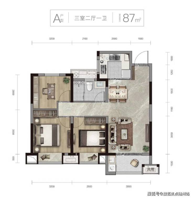 A户型 朗璟 建面约87㎡ 三室二厅一卫
