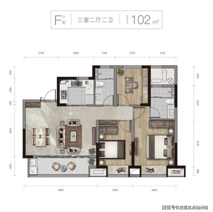 F户型 宽璟 建面约102㎡ 三室二厅二卫