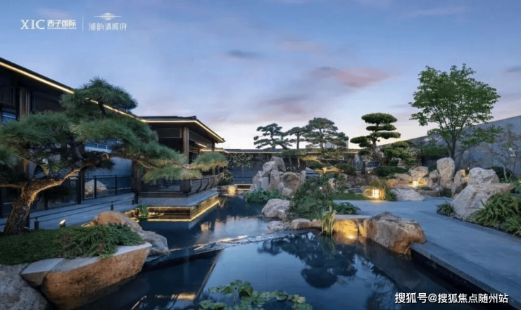 建筑立面采用石材基底搭配金缕格栅,巨幅采光屏消融建筑与自然的边界,简约大气又不失东方雅致;景观打造“一轴两苑八景、两街九巷”宋式园林,引东沙湖水入园,全冠移植珍奇绿植,复刻千里江山图意境,步移景异,四季有景。