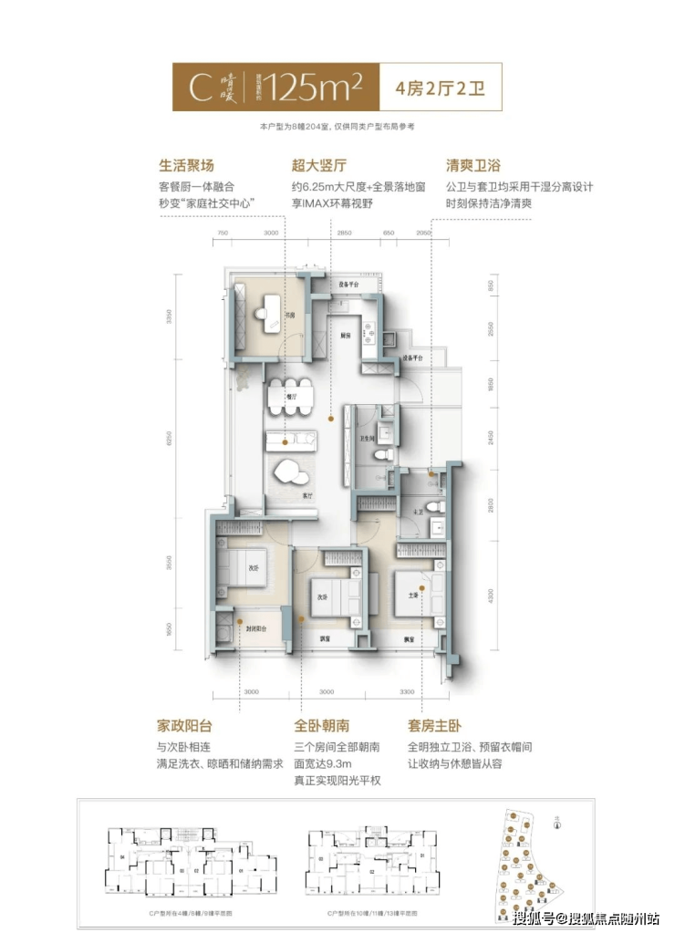 项目规划104-169㎡精装三至四房,覆盖刚需至改善需求。以125㎡户型为例,6.25米横厅+三房朝南设计,实现全明格局与IMAX级采光;169㎡户型南向面宽达17.3米,主卧套房配置独立卫浴与衣帽间,兼顾私密性与舒适性。