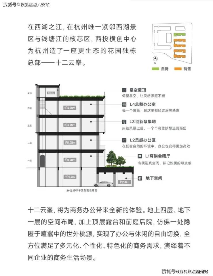在杭州办公物业市场中,独栋花园式办公产品极为稀缺,特别是西湖区这样的核心区域。西投横创商务中心推出的“十二云峯”产品仅15席,每栋建筑面积约1300㎡起,采用“4+1”墅式建筑结构,打造低密生态办公空间。