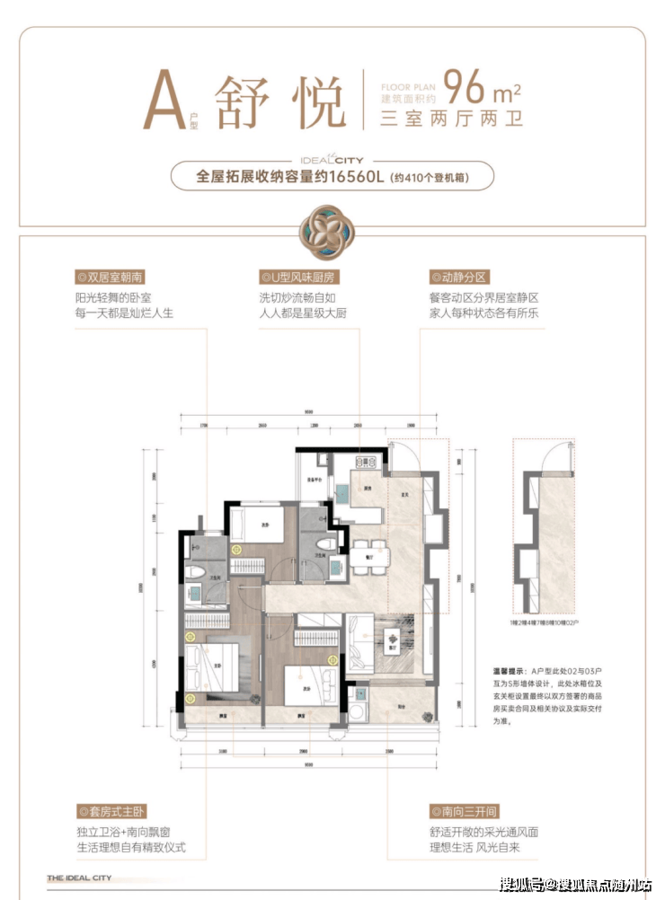 建面约96㎡户型,虽是入门级产品,但空间感丝毫不输大面积。三开间朝南,阳台+双飘窗,采光、通风兼优;双卫配置、主卧套房、S墙预留空间,动静分区合理。