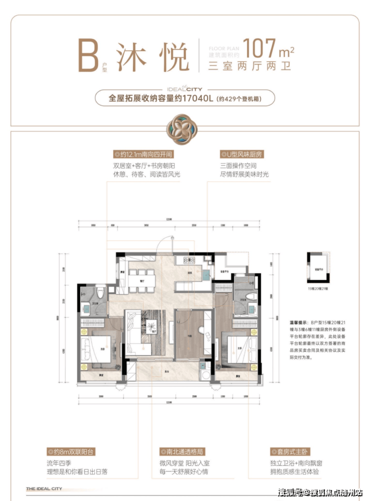 建面约107㎡户型,则把重点放在舒适度上。阔绰方厅+双联阳台,通风赏景至佳,还有U型厨房,三面操作空间,动线流畅好用;套房式主卧更配置了步入式衣帽间,独立卫浴设计,保证了主人家的隐私和仪式感。