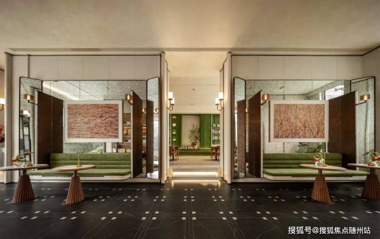 步入门庭,云石吊顶之下,借鉴中国古代建筑中的“藻井”做法,由522片皇家白玉石材拼接而成,凝聚光华,辉映时空。华光之下,中心水池承托起艺术雕塑,莹润皎洁,宛若珍宝。立面则采用铂金钻奢石,搭配墨绿荷塘月色奢石、安哥拉黑奢石花钵、以及手工锻造的巨幅铜门,流淌出一抹温润质感。