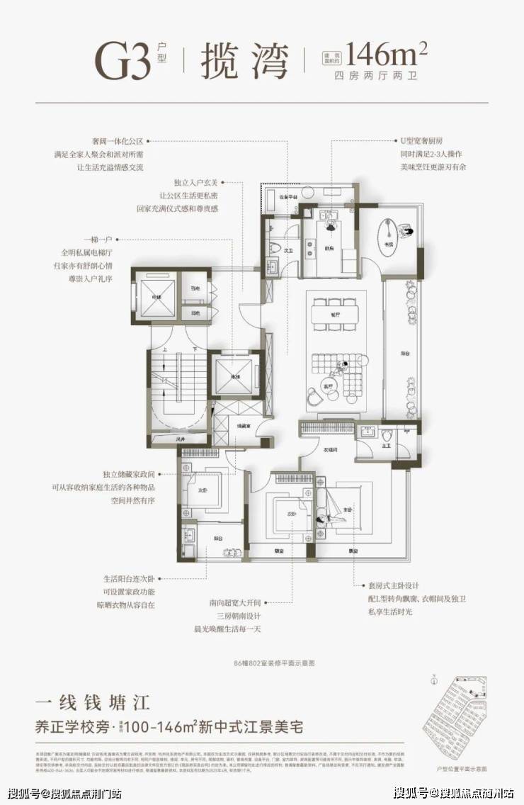 建面约146㎡则分为横竖两款,全部一线朝江。两梯两户,都有独立电梯厅。“横版”是四开间朝南+大方厅,“竖版”有大边厅+超长转角飘窗的“全景舱主卧”。