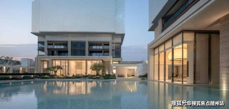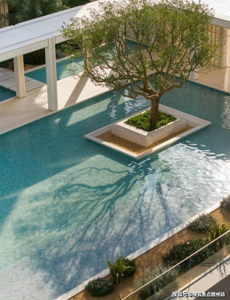 为此他们反复调试了水院底部的瓷砖颜色,以及水的深度,让它与纯色系的石材柱廊、立面,彼此呼应。同时,整个水系也用了和泳池类似的净水系统,不光要在销售阶段保持纯净,今后交付了,同样要打理得纯净透亮。